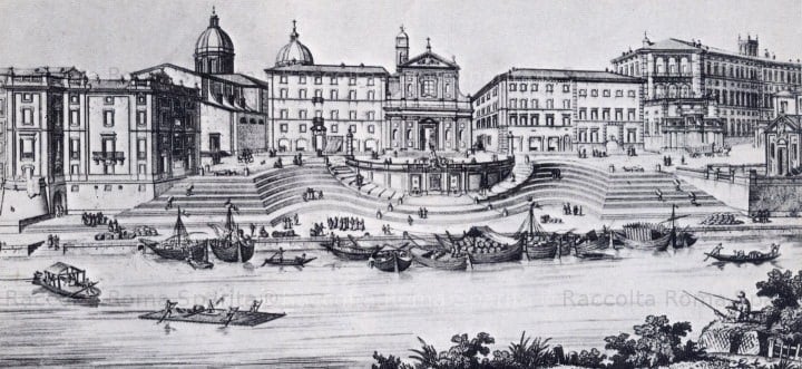 Originally it was a rudimentary illegal marina, roughly at the height of the church of San Rocco, for the unloading of wood, coal and wine. In 1704 Pope Albani, Clement XI, approved the proposal of his president of the roads for the creation of a system of quays, stairways and square. Much of the material comes from an arch of the Colosseum, which provided a valuable material such as travertine after an earthquake.