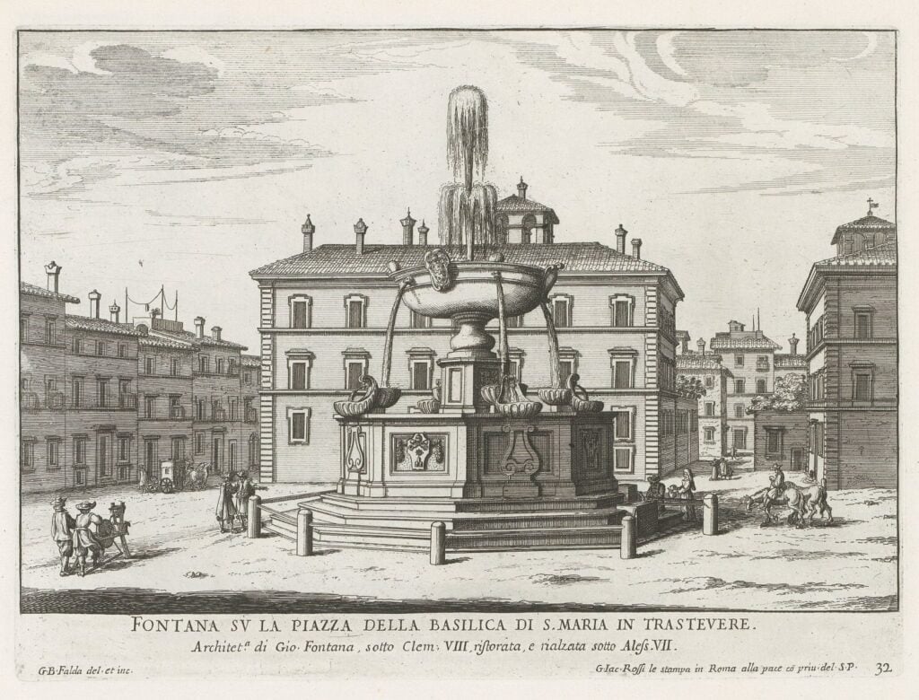 At the beginning of the century, there is news of an intervention carried out by Girolamo Rainaldi, probably following the arrival of the Acqua Felice in Trastevere. At the time of Pope Alexander VII Chigi (1655-1667), the fountain was moved to the center of the square and was equipped with a greater amount of water from the renovated Traiano-Paolo aqueduct.